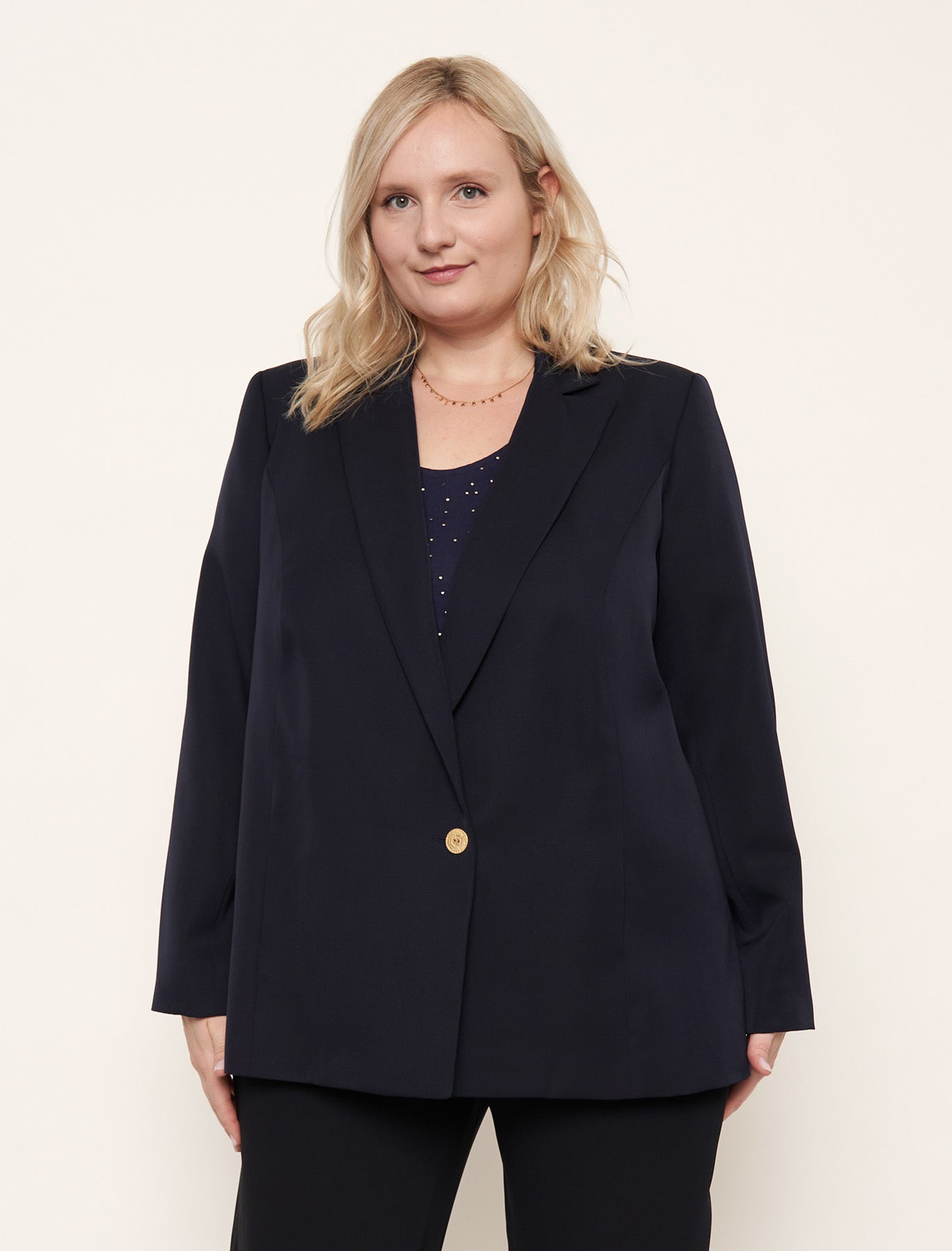 Jacket with tailored collar in high-end fluid midnight blue wool. Slightly fitted and crossed cut while maintaining great comfort. A golden metal button closes the jacket in all elegance.