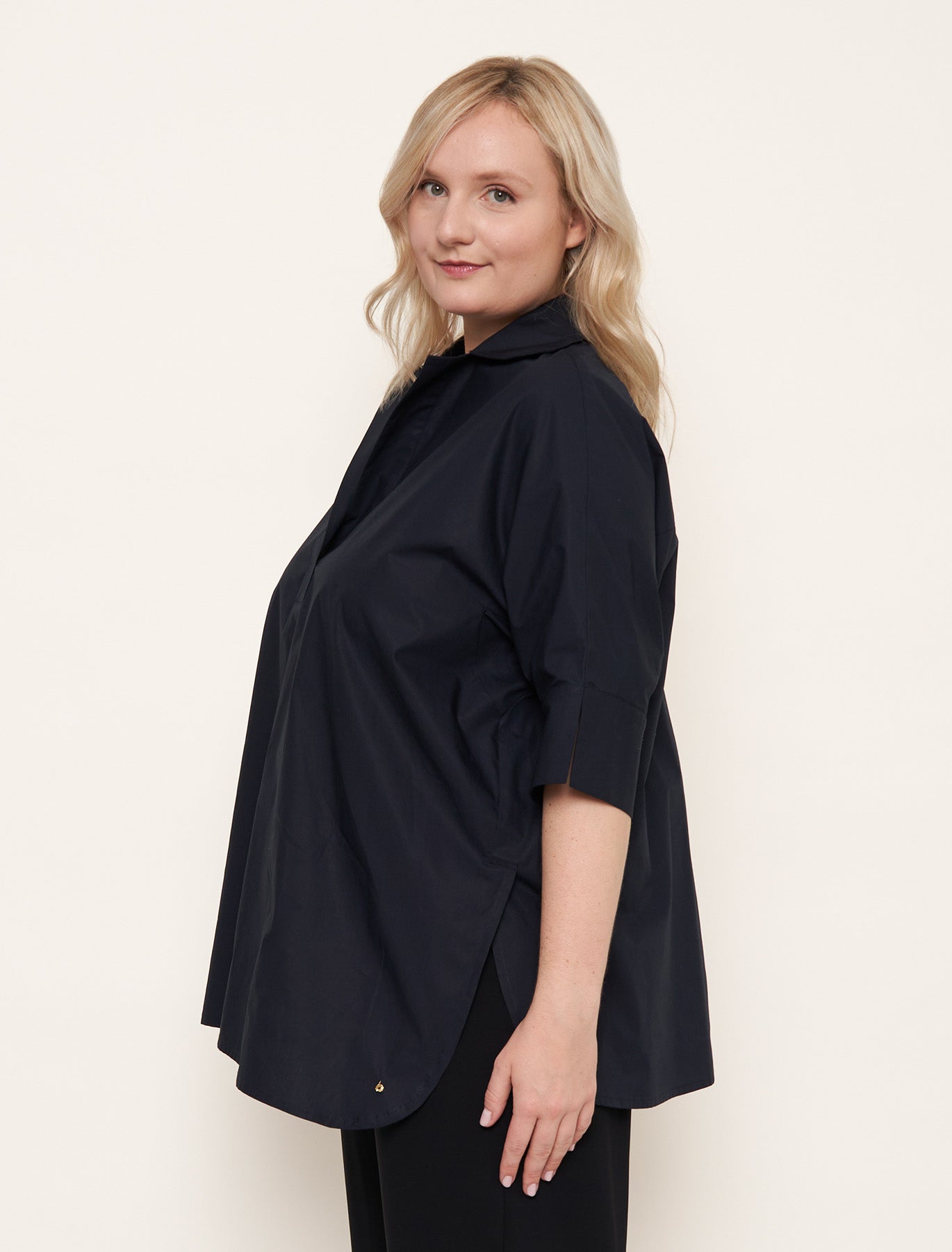V-neck blouse with short sleeves made of midnight blue cotton poplin. The box pleat in the back, the gussets under the arms and the rounded sides increase comfort and elegance.